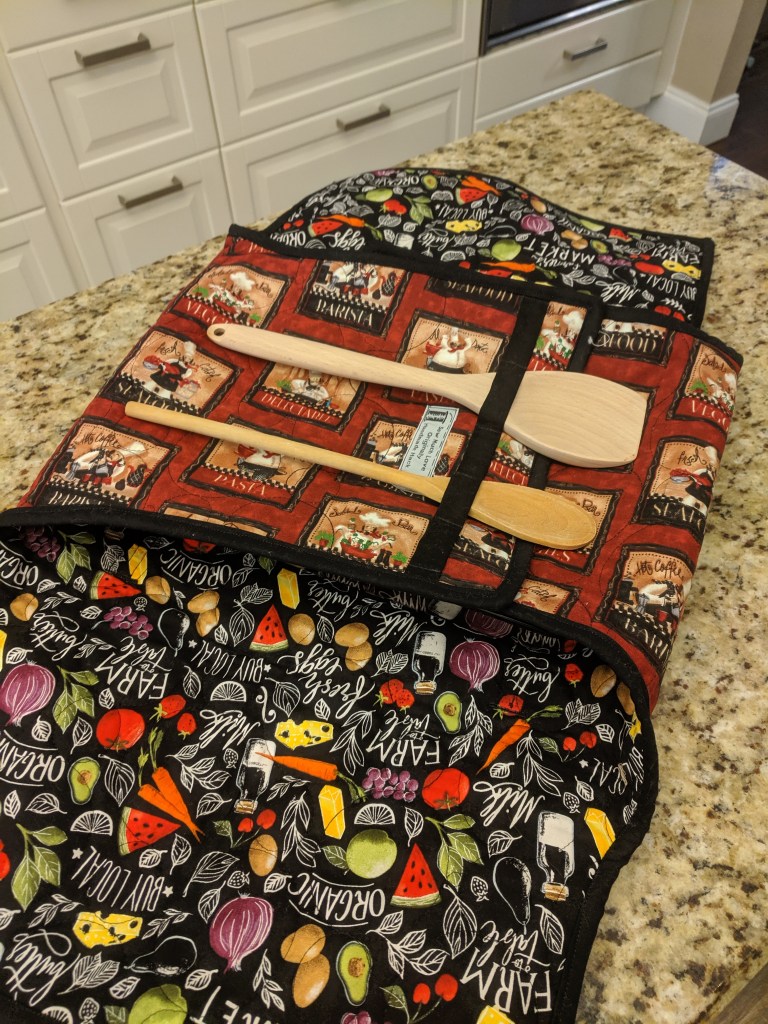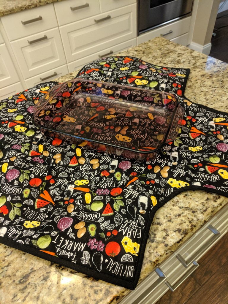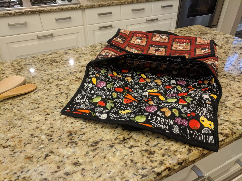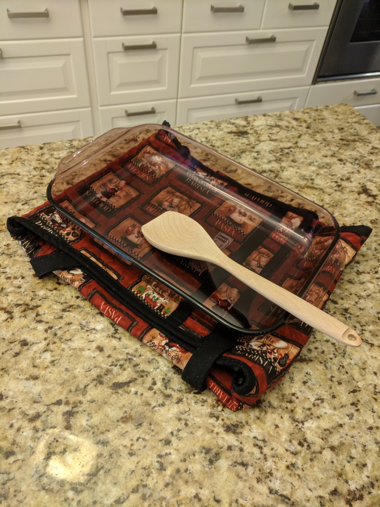 Carrying your signature dish to the party or family holiday party is hard enough without wearing pot holders. What about arriving to the party and the food is cold? Well Stitched & Quilted has your food covered! Comfortable carrying handles made with cotton webbing make transporting a standard 9×13 casserole dish safe and easy, and even has a holder for serving utilizes.